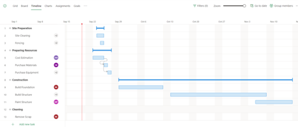 - Timeline (Gannt chart): A chronological view of all the task dates and duration, dependencies, and buckets. This section allows users to easily view the timing of the project to ensure that they stay on track. It also allows users to adjust dates by simply clicking and dragging the boxes generated on the timeline. For example, to make the “Site Cleaning” task longer, you can pull the right side of the associated blue box further down the timeline.