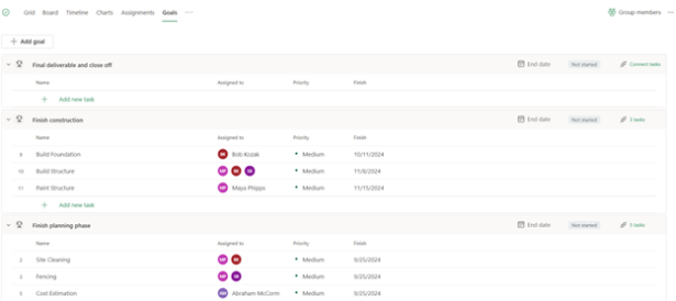 - Goals: Used to create and track project-specific goals. Upon creation, users can link tasks needed for the goal and to add a color to the goal for better visualization within grid view. In addition, users can update the status of goals to be one of the following categories: not started, on track, behind, at risk, and closed. Each status also has its own color associated to it as well.