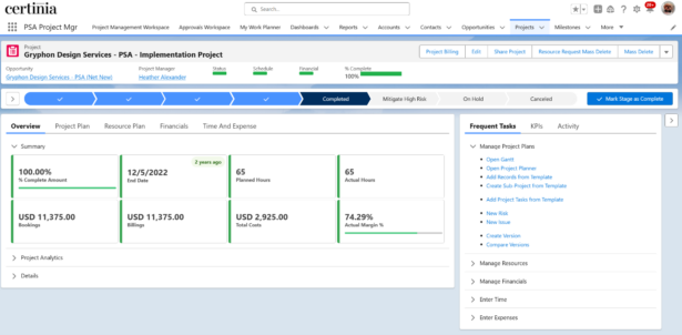 Certinia, formerly known as FinancialForce, provides software built on the Salesforce platform designed to meet the needs of organizations charged with delivering professional services. Through its Professional Services (PS) Cloud functionality, Certinia offers Project Managers a unified solution for managing their projects, resources and financials eliminating the need for managing these functions in their own silos. Highlighted below are several features within the Project Management module designed to streamline and add efficiency to the project management process.