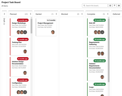 The Project Task Board allows project managers to view and update the status of project tasks. The filtering and search box functionality make it even easier for the project manager to find the relevant tasks they need.