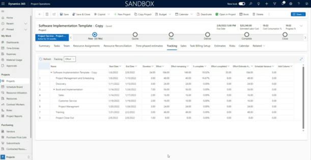 The Effort Tracking View tracks the progress of a schedule. It compares the actual effort hours spent to the planned effort hours. There are four main metrics used in the Effort Tracking View: Progress Percentage, Estimate to Complete, Estimate at Complete, and Projected Effort Variance. This view is special because it shows progress bars and color coding to allow the user to know what tasks are on track, at risk off not being completed, and over/under budget. The way to view this view is Project Operations > Projects Pane > Tracking.
