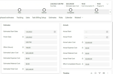 Overall, the home page allows for the user of Dynamics 365 to compare the Actual versus Estimate cost. In the graphic below, the user can view all estimates the user/company forecasted versus the actual cost to compare the costs. This is important for businesses due to the fact they do not want to spend more than they estimated for the period. Also, you can view the Progress % and Cost Consumption % explaining the percent complete.