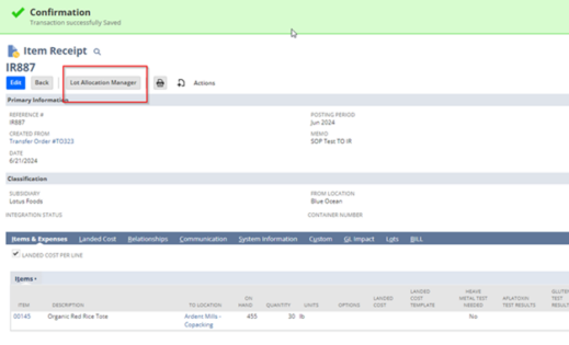 The NetSuite UI entry point for the tool is the ‘Lot Allocation Manager’ (LAM) button on every inventory posting transaction. Giving users the ability to enter, and yes, reverse lots. LAM functionality is WebApp based and designed for ease of accessibility and with a consistent look and feel regardless of transaction type.