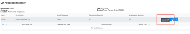 Once a lot has been allocated to the transaction line item, the LAM will reflect the Lot such as in the image below.