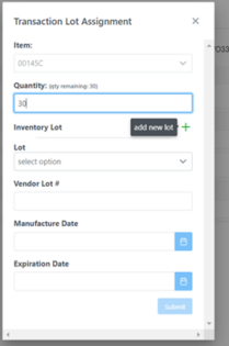 When creating a new lot ID, you press the green, plus-sign icon titled ‘add a new lot’. You fill out the lot information and press Create Lot. Once the window has refreshed, click Submit to allocate your lot.