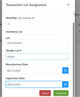 In this window, you will have the option to create a Lot and/or use an existing Lot depending on the type of transaction you are applying it to.