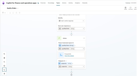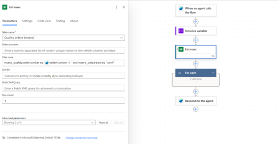Figure 1: Power Automate flow that is connected to the Quality orders data entity that fetches the quality order information and returns it to the Copilot Agent.
