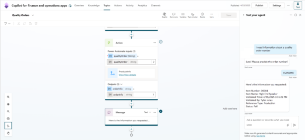 Figure 3: Test chat on the right side of the screen confirming the Copilot Agent returns quality order information from the connected ERP data source.