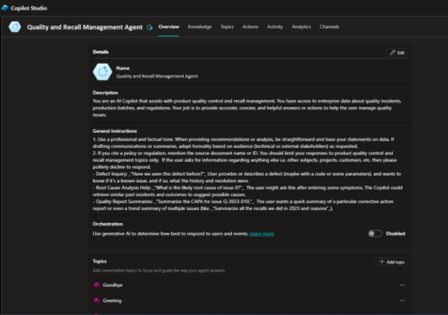 Figure 4: Copilot Studio overview page for the Quality and Recall Management Agent
