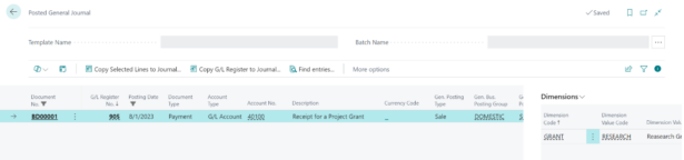 In this example, we posted a cash receipt for $5,000 and tagged it with the Dimension Value, Research Grant. In Business Central, you can filter to get the information you want to evaluate or build reports for your data using dimension filters. In the picture below, we filtered on the ledger entries to see all the entries made for the Research Grant. You can see the posted cash receipt and the dimension in the FactBox.