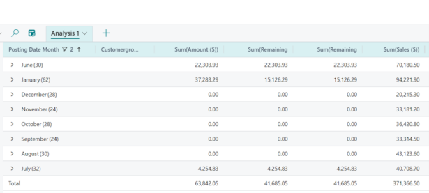 From the Customer Ledger Entries Page using Filtering and the Analysis Mode