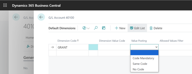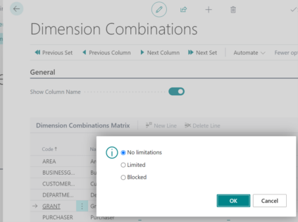 Depending on your business, certain dimension combinations may be contradictory. Business Central allows you to block or limit certain combinations, on the Dimension Combination page.