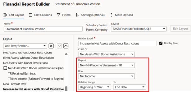- 2. In the second reference row, select the relative date range as Beginning of Year to End Date to represent the increase in Net Assets