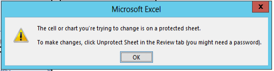 Now your users can only enter data on the cells you designated. If they try to change a cell that is protected, they will get a popup error message:
