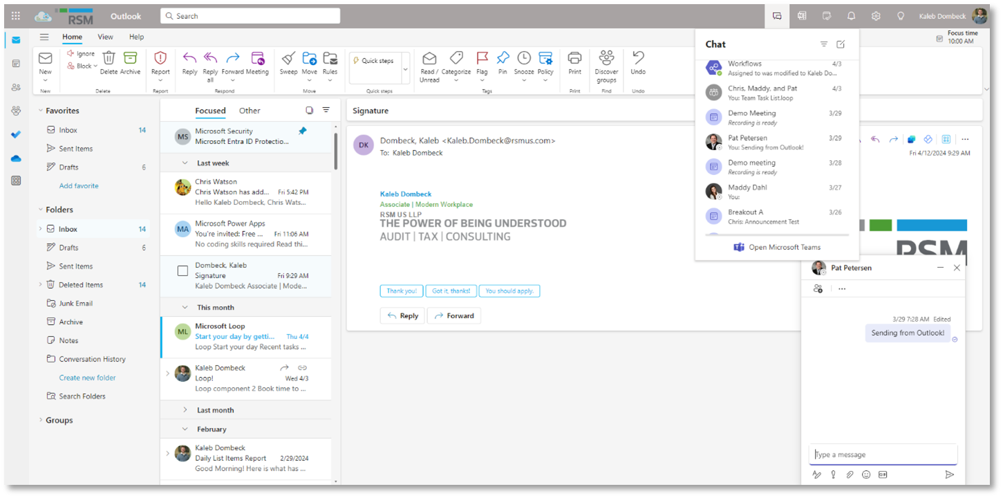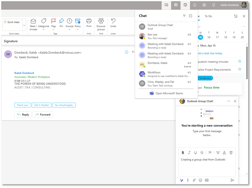 Now you can check on incoming Teams chats as well as start new 1:1 and group chats – all from your Outlook environment. This new feature in Outlook on the web is just the beginning of many M365 vertical integrations within the application. In theory, you can access your inbox, calendar events, To Do tasks, and Teams chats all on the same screen!