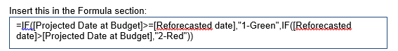 - In the formula section, you will have the following so that it if the projected date at budget is greater than/equal to the re-forecasted date than it’s ‘on-target.’ If the projected date at budget is less than the re-forecasted date than the task is ‘off-course.’
