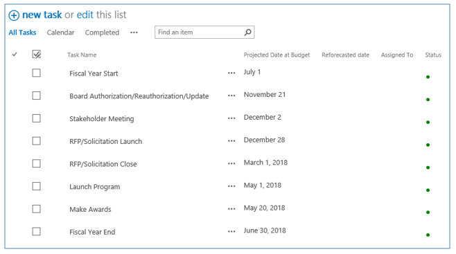 - First, go to the app store and create a new task list. If you want to use the start date and due date columns to show KPIs, you will need to choose the two columns so that it appears on the timeline. Then you can rename the two columns to, “projected date at budget” and the, “re-forecasted date.”