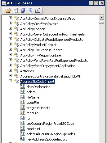 In AX 2012, this task is fairly simple as there is an abstract class (AdressZipCodeImport) that takes care of this function. In addition to the abstract class, there is another class (AdressZipCodeImport_US) for each specific country that overwrites the ReadFile() method in the AddressZipCodeImport abstract class. In AX 2012, there only 4 countries available for Zip Code upload.