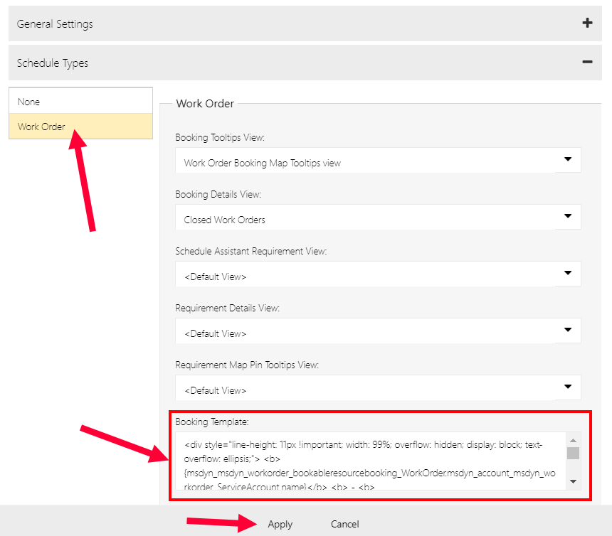 Within the Schedule Types box, click “Work Order” on the left, paste your code in the “Booking Template” box and then click “Apply”.