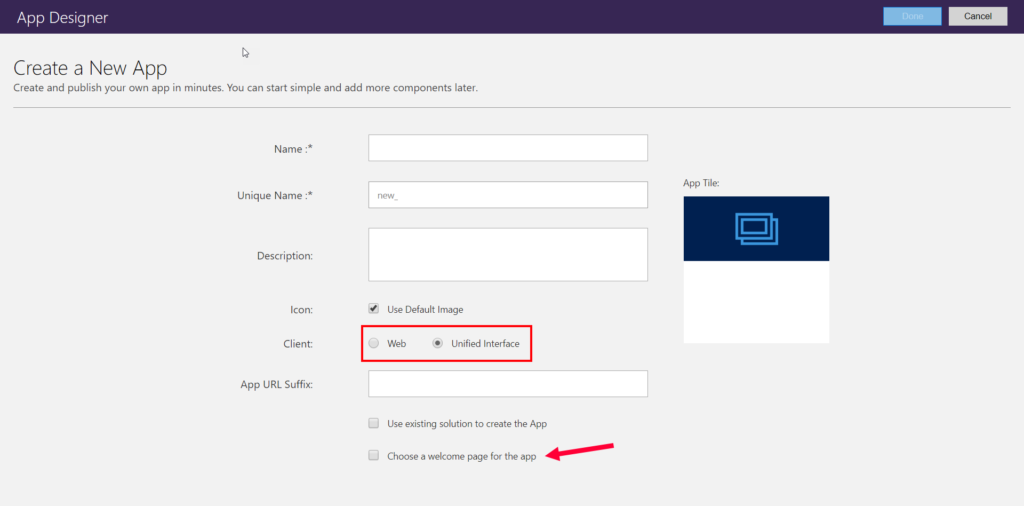 Fill in the needed information. With the introduction of V9.0, you have the ability to choose an app specific to the Web or the new Unified Interface.