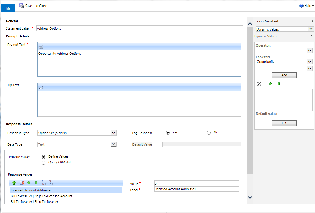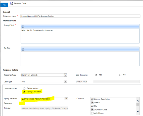 Add Step>>Prompt and Response>>Name: “Licensed Account Bill To Address Option”>>Click Set Properties>>Fill out the screen as below
