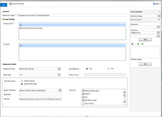 This is where everything comes together. On the form, then, for each field, you are selecting the corresponding field from the prompt and response address fields. This is how you wire (or connect) the update you are performing (on the opportunity for this example), back to the selections made by the user.