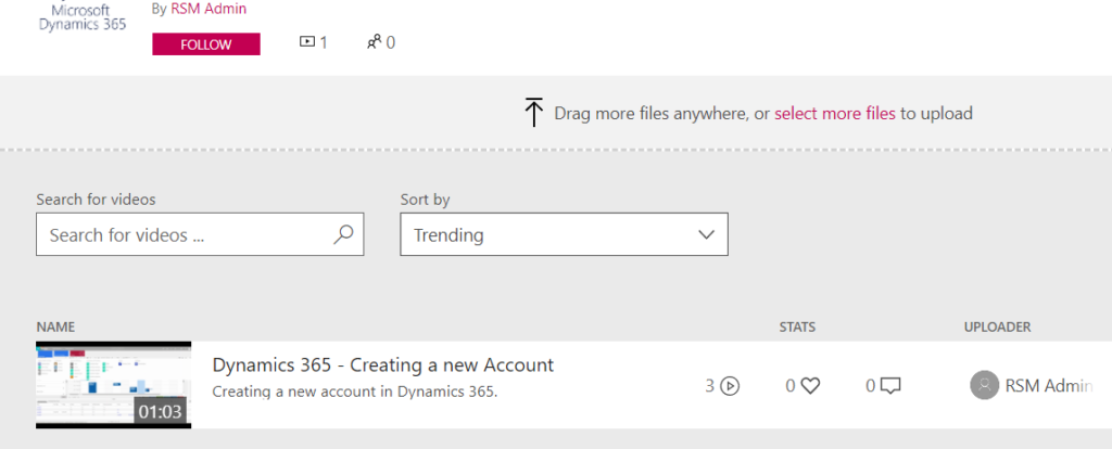 For this example, I created a channel which is a playlist of all the training videos specific to Dynamics 365. When I open up the channel, users will see all videos in the system in this category.