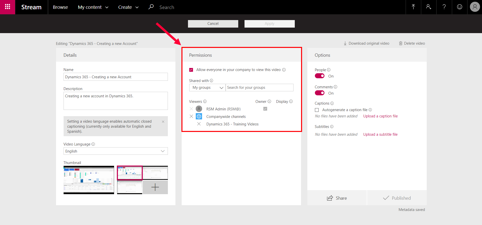 You can also control the security permissions around who can view a video, which is a great way to lock down access if they are specific to a certain level or department.