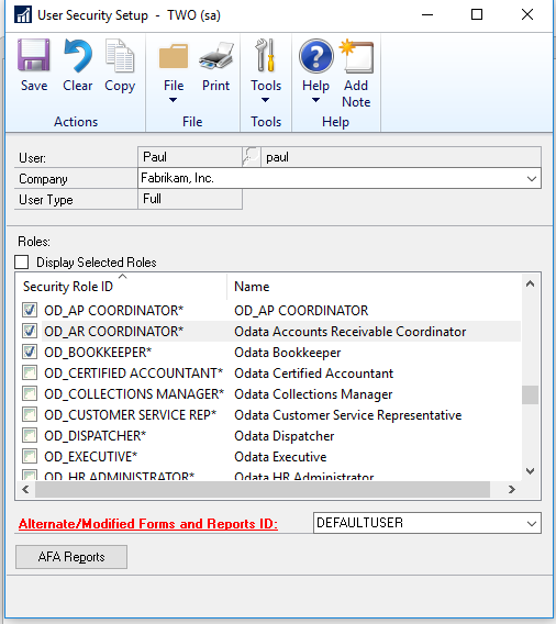 The next thing you will need to do is grant security. One of the points behind the implementation of OData in GP 2016 is to make it easier for the front office to manage, meaning that you don’t always need your IT team or consultants to step in for security. Because of that, there are new roles in GP specifically designed for OData. These roles start with “OD_” and generally match up to the roles offered when you first login to GP. If these roles are missing for you, there is likely a script which can be run to create them for you. Once you assign one of these roles to a user which has their active directory account mapped, they should have access to all of the OData objects that are assigned to that role.