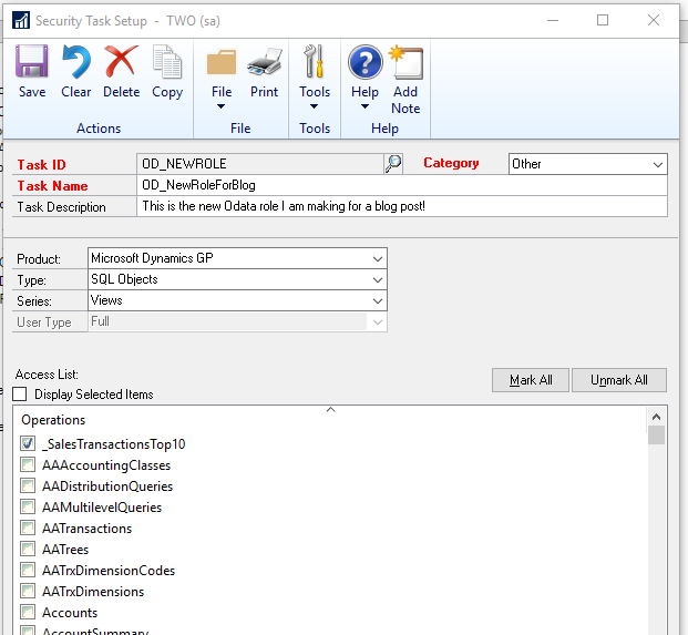 You can also add custom SQL objects to the OData roles. If you created a new view, or have a third-party view which you want to access the data from, all you need to do is create a new role in GP for those objects, or add them to an existing OD_ role. This can be done in Security Task setup, and will look like this: