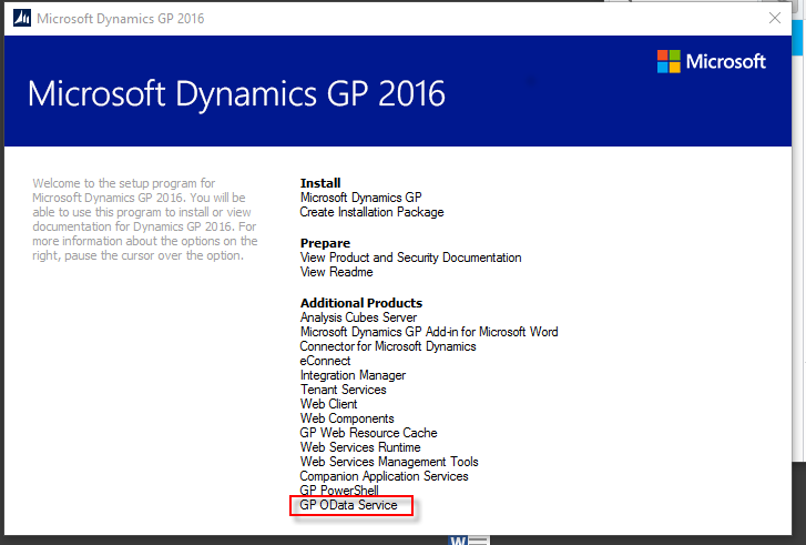 The first thing you will need to do is install the actual service on a server. Go to your GP 2016 media and find the GP OData service: