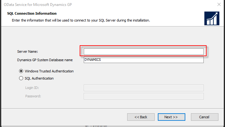 Enter the name of your GP server and your system database. Put in credentials which have the ability to connect to SQL:
