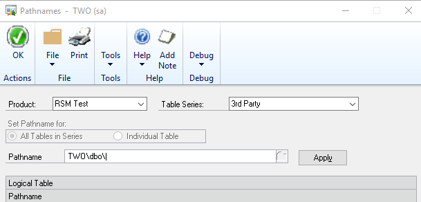 To add the desired entry, select your Product – for me this is the name of my Dexterity project I’ve installed in Dynamics which I have called RSM Test. Next, select 3rd Party in the Table Series drop-list. This final step you must ensure you type correctly. The Pathname is in the format <database><schema> and so you want the database name and ‘dbo’. For this example, it is TWOdbo. Click Apply to save the entry and the application will now seek to communicate with your 3rd Party tables in the correct database.