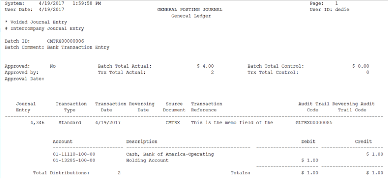 – GL Account Number - After entering values in all required fields, click Print Check and Post. The Mekorma
