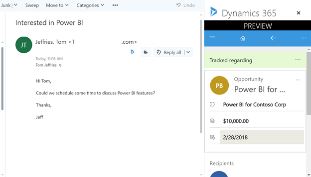 All told, the Dynamics 365 App for Outlook is here to connect your customer communications in Outlook to your customer data in Dynamics 365, making it quick and easy to retrieve, update, and create new Dynamics 365 records without interrupting your customer-centric workflow.