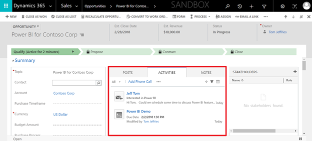 The Activities pane on a Dynamics 365 record shows a history of activities, including those tracked using the App for Outlook