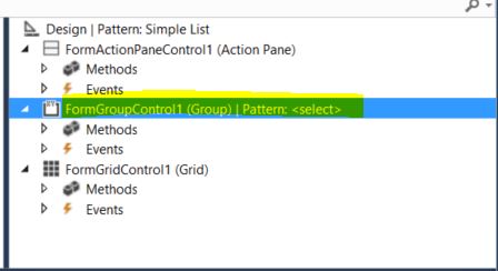 - Right-click FormGroupControl1 (Group) | Pattern <select> and select Apply pattern > Custom and Quick Filters.