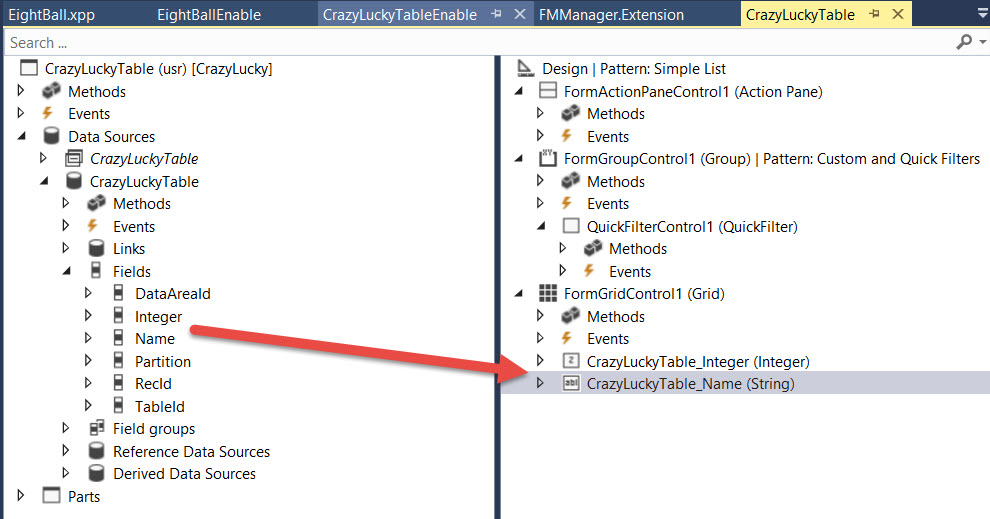 - Drag the Integer and Name fields from the CrazyLuckyTable data source (left side) to the FormGridControl1(Grid) (right side), as shown below.