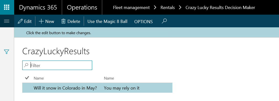 This article explored the key aspects of queries, forms, privileges, menu items, menus, and security roles in MsDyn365 for the Magic 8 Ball. In this process you created the interactive model by which a person can now not only run the Magic 8 Ball, they can control the results set. Because the Magic 8 Ball was designed in our earlier blog article on X++ Control statements to simply select the right answer from a random number that is generated your new answers will work. One item to note, is that you cannot have any more than 20 items in your selection list. Of course, there is not a regular icosahedron behind the scenes, but we can set the maxVariable to 20. If you were to accept user input or to find the number of objects in the answer table, this would be a challenge beyond this exercise where you can attempt to improve your customization. Enjoy the Magic 8 Ball, but keep in mind that it is not recommended for production or for those 100+ years and older!