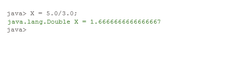 In order to do a decimal division, we will have to specify the numerator and denominator as real (float) numbers, as shown below in Java. Please note that the result is displayed with double precision, which shows more significant digits after the decimal point.