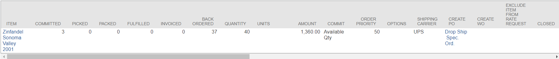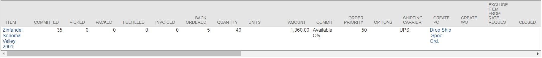 - Ordered Zinfandel item, qty of 40, order priority of 50 on the line item