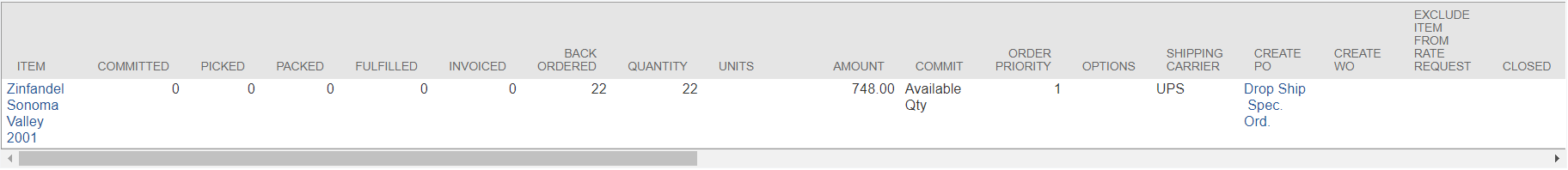 - Ordered Zinfandel item, qty of 22, order priority of 1 on the line item