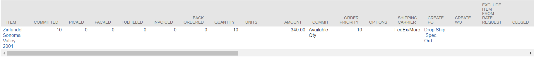 - Ordered Zinfandel item, qty of 10, order priority of 10 on the line item