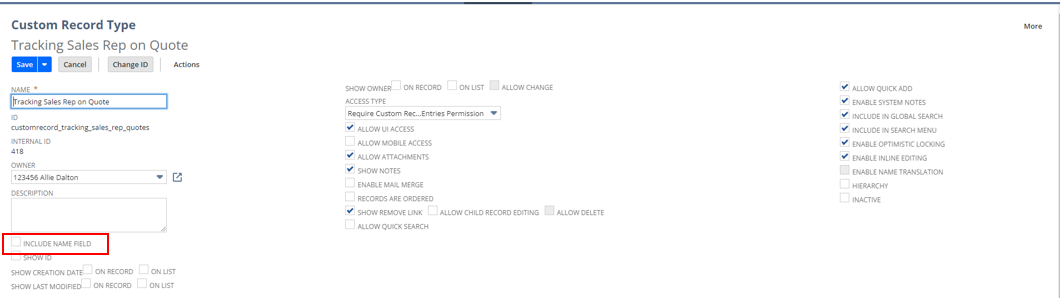 NOTE: If you do not uncheck Include Name Field, a Name will be required on every single new custom record. It is recommended to uncheck this as these custom records are created through a workflow action.