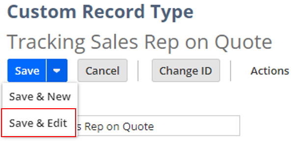 Once you have all of the custom record preferences set up, hover over the arrow next to the Save button and select Save & Edit. We next want to add custom fields that will be on the custom record.