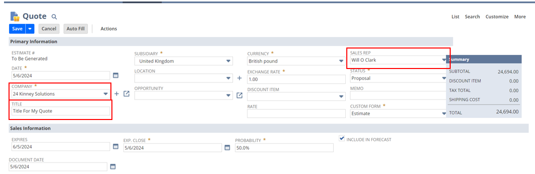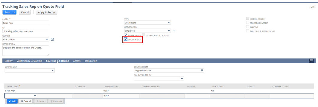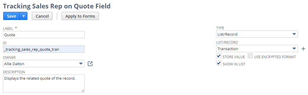 Add any other fields you want to display on the custom record. For this example, we will be adding fields “Sales Rep”, “Customer”, and “Title” that will be pulled from the Quote transaction.