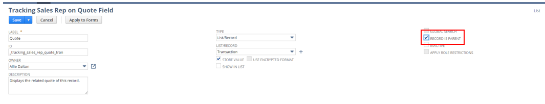 Lastly, check the “Record is Parent” checkbox. This is telling NetSuite that the Quote (or whichever transaction is selected) is the parent of our custom record. This turns our custom record into a child record of the transaction.
