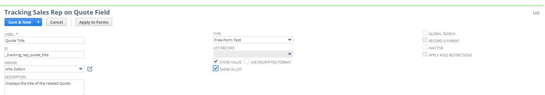 Record Type: Tracking Sales Rep on Quote (or name of Custom Record created)