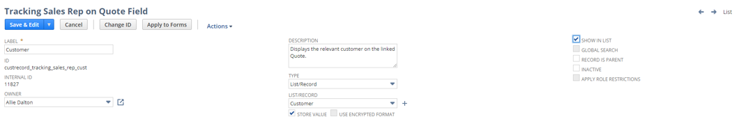 For example, we want this custom record to show on Quote transactions, so we will add a field “Quote” on our custom record.