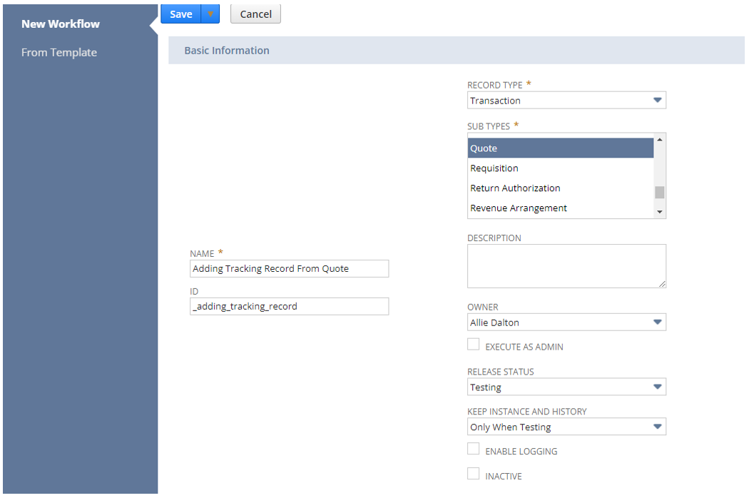 Next, we want to create our workflow action that will automatically create a Tracking Sales Rep on Quote record when a Quote is created.